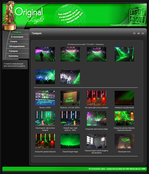 Создание интернет магазина Оригинальный свет.О компании Организация лазерных шоу; лазерные рекламные ролики (лазерная анимация) для PR-акций, полномасштабных акций, фестивалей, презентаций, выставок; объёмные лазерные шоу, в любом музыкальном формате; сопровождение шоу-программ, выступлений артистов, в танцевальных клубах; прорисовка лучом лазера главного персонажа шоу, виновника торжества или юбилея, молодоженов. Разработка технических проектов всех видов лазерной рекламы; проекция логотипов на высотных зданиях и сооружениях, просветных экранах, фонтанах, пиротехническом дыму. Создание специальных анимационных лазерных клипов для спектаклей, театрализованных мероприятий; Поставка, инсталляция и обслуживание лазерных систем; О проекте |